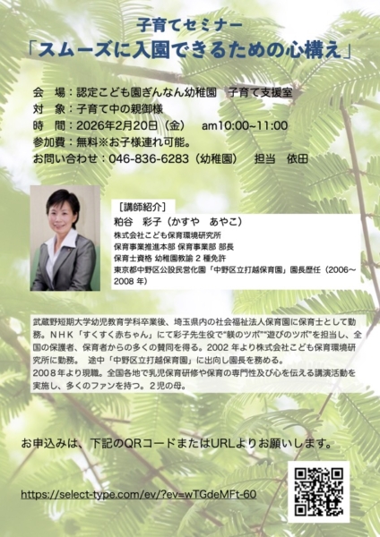 子育てセミナーを開催いたします。テーマは「スムーズに入園できるための心構え」です。